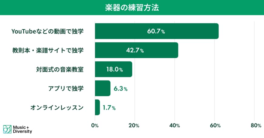 「YouTubeなどの動画で独学」が60.7%と圧倒的であり、「教則本・楽譜サイトで独学」も42.7%と約四割になっています。