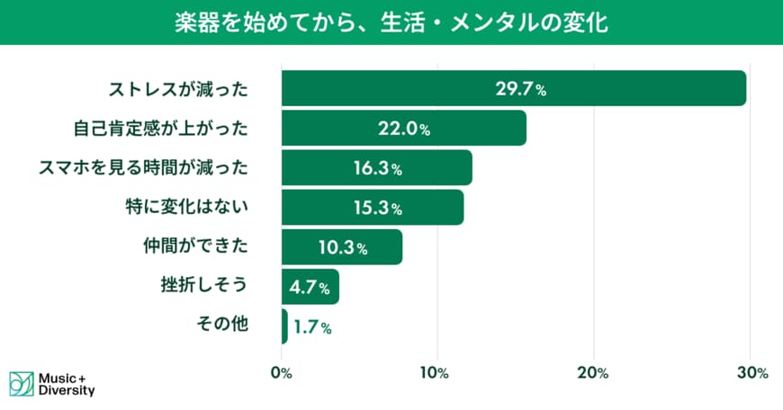 楽器演奏がもたらす生活やメンタル面への影響は、非常にポジティブな感覚として現れているようです。