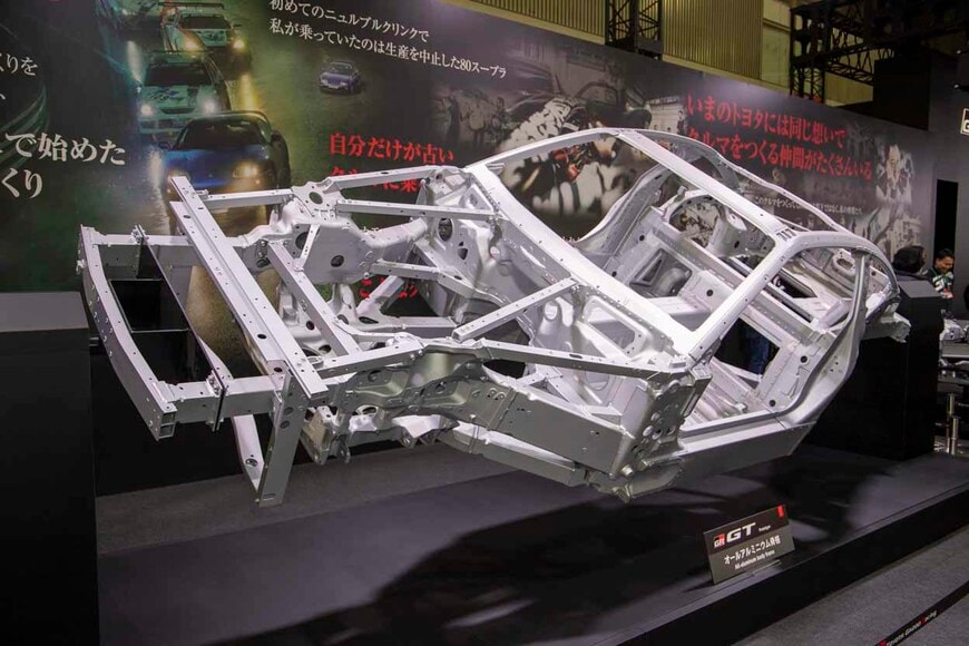 ブース内には完成車だけでなく、エンジンのカットモデルや、トヨタ初となるオールアルミニウム骨格の構造展示も用意されていました。外観だけでなく中身を見せる展示からは、このプロジェクトに対する自信がうかがえました。