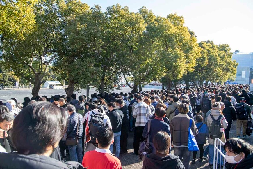 会場は西駐車場に加え、南通路まで拡張して使用され、開始前から西駐車場には多くの人が集まりました。平坦な駐車場のため後ろの人はまったく見えず、危険防止のために小さな子どもを肩車するのは禁止されていたため、楽しみにしていた子どもはエキゾーストノートしか味わえなかったかもしれません。