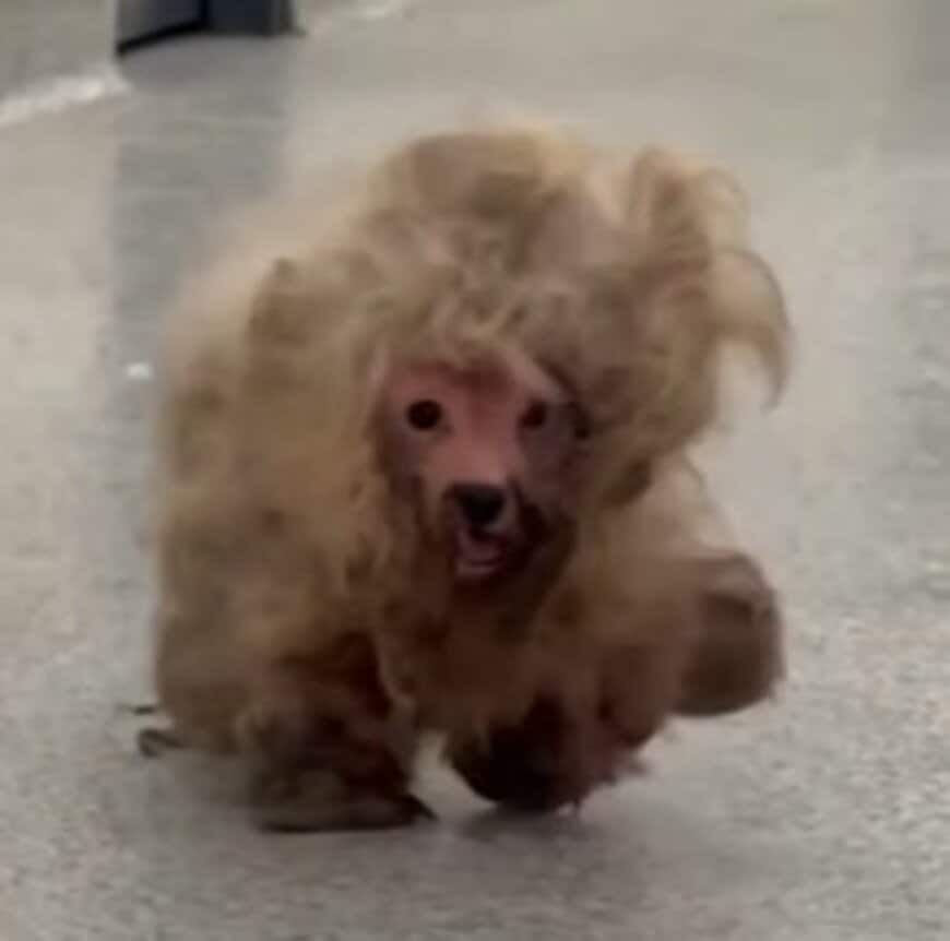 海外のSNSで話題になっているのは、茶色い毛玉のような状態でヨロヨロと歩いているところを保護された、犬の「Dolly(ドリー)」。