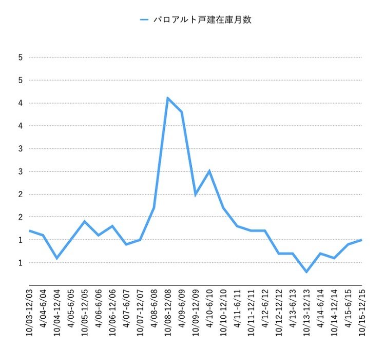そもそもパロアルトは40~50年前にそのランドスケープのほとんどができた町であり、新規開発が極めて少ないことが言えます。以下のチャートが示しているように、新規を含めパロアルトにおける戸建ての在庫は、過去12年における四半期ベースの平均で見れば、わずか1.36か月程度です。