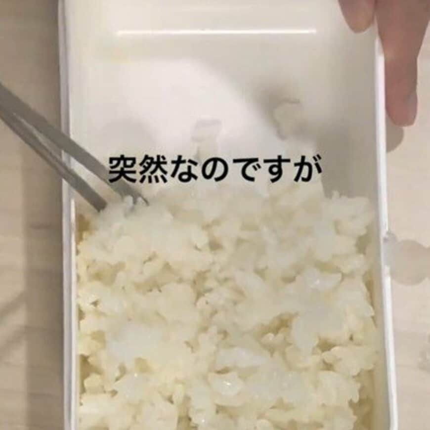今回、会社員の@srino.795さんが自分のために作るのは、目にも鮮やかな「肉野菜炒め弁当」です。まずはご飯をお弁当箱に詰めていき、お箸で形を整えます。