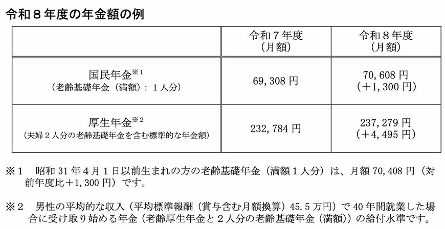 厚生労働省が公表した「令和8年度の年金額改定についてお知らせします」によると、2026年度は前年度に比べて、国民年金(基礎年金)が1.9%、厚生年金の報酬比例部分が2.0%引き上げられる予定とされています。