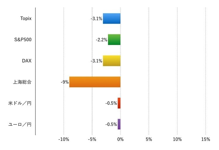 先週(1月11日‐1月15日)の世界の主要株式市場は続落しました。主要通貨の動きは小動きでしたが、株価の下落が世界的に進みました。