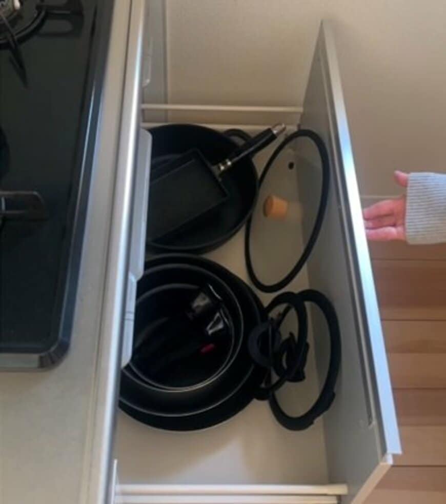 変身前のコンロ下収納は、フライパンや鍋、蓋が重なって収納されている状態。整理されているものの、スッキリ収納とは言い難い印象です。