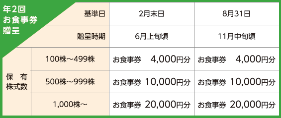 毎年2月末日および8月31日現在の株主名簿に記載または記録された当社株式1単元(100株)以上を持つ株主