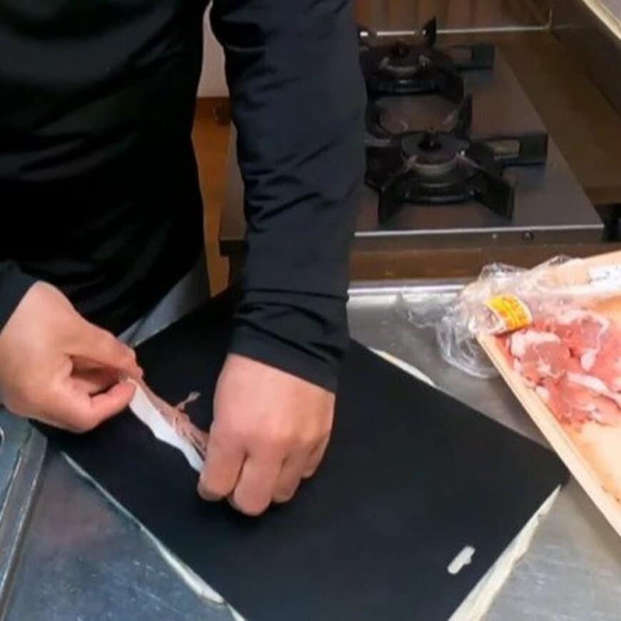 1. 【豚しそ巻き焼き弁当】豚こま肉を広げて大葉と一緒に巻いていく