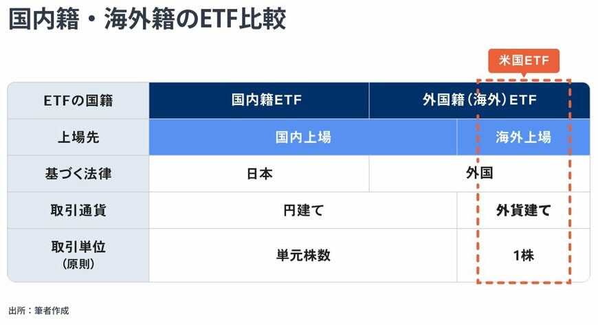 ETFは、大きく分けて主に日本の法律に基づく「国内ETF」と、海外の法律に基づく「海外(外国籍)ETF」の2種類があります。