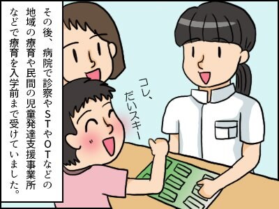その後、病院での診察やST、OTなどの地域の療育や民間の児童発達支援事業所などで、入学前まで療育を受けることになりました。