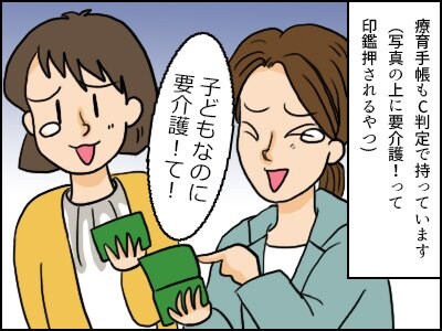 写真の上に「要介護!」と押されている、まっきーの療育手帳。悲しいやら、可笑しいやら…。でも、同じように療育に通うママたちと、そんな冗談を言い合うことができるのも、なおにゃむさんの励みになりました。