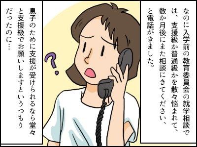 そんなある日、教育委員会が入学前に行う就学相談から電話があり、普通級にするかどうかを(お願いしていないのに)悩まれた上に、「数か月後にまた相談にきてください」と言われてしまいます。