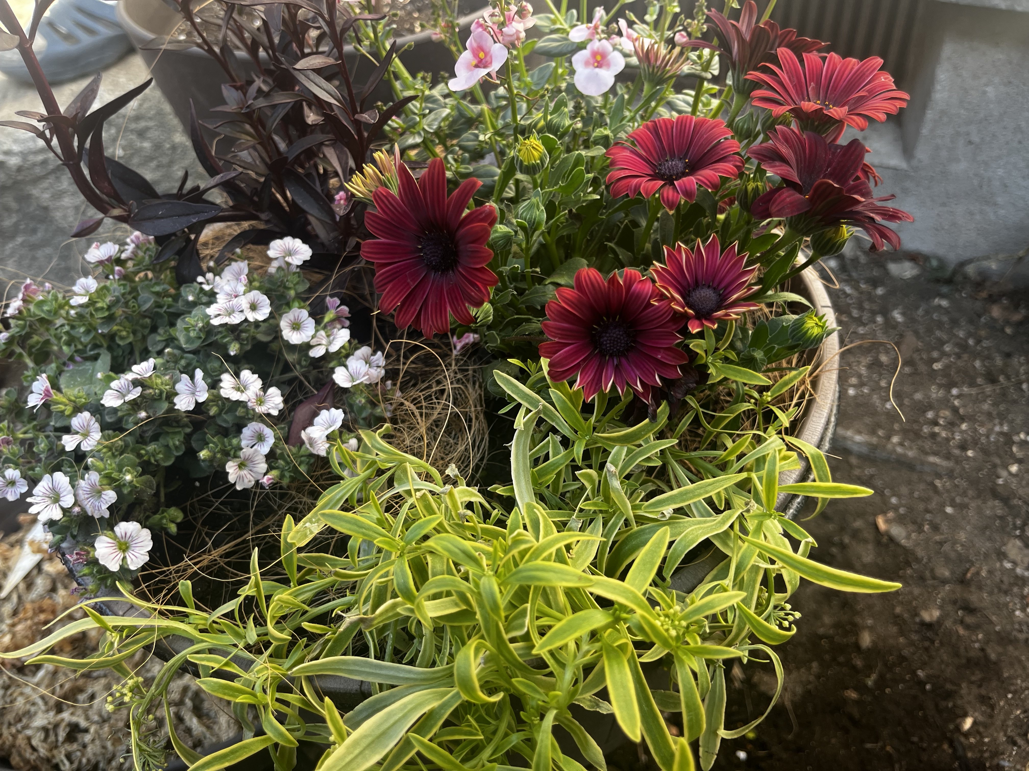 オステオスペルマムのワインレッドカラーとのコントラストが確保され、お互いの存在がより映える寄せ植えに仕上がりました。