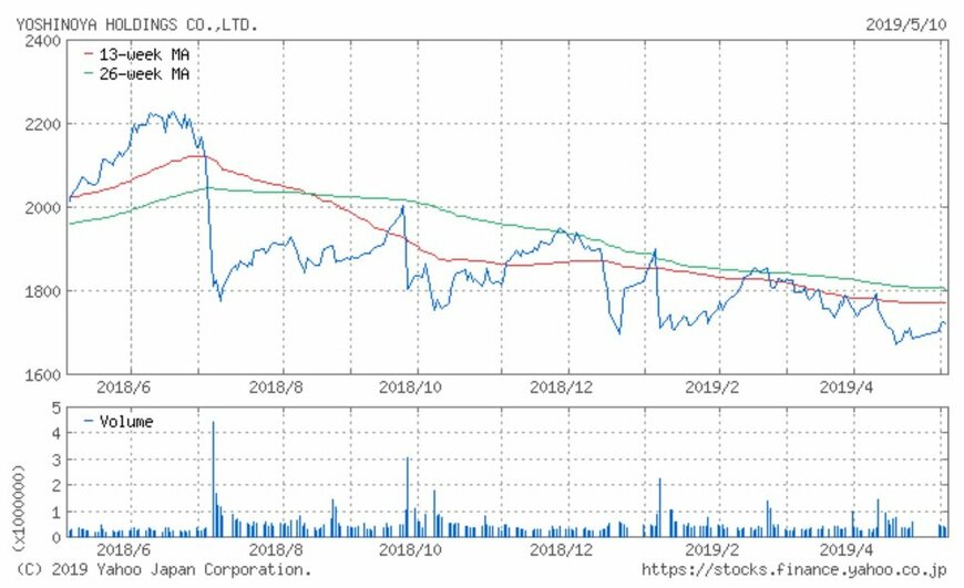 シリーズでお伝えしている「注目小売店月次実績」。今回は牛丼チェーン店「吉野家」他を運営する吉野家HD(9861)の、2019年4月に関する月次動向及び過去実績、または過去1年の株価動向について振り返ってみましょう。