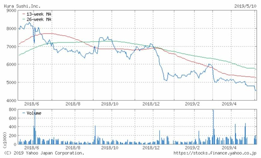 シリーズでお伝えしている「注目小売店月次実績」。今回は回転寿司チェーンを運営するくら寿司(2695)の、2019年4月の月次動向及び過去実績、また過去1年の株価動向について振り返ってみましょう。