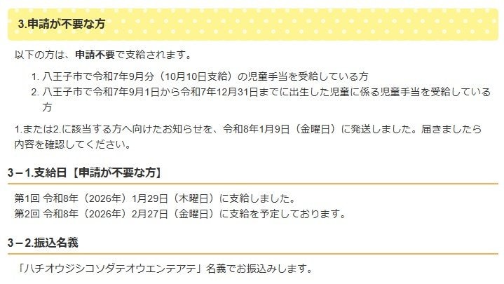 例えば、東京都八王子市では、申請が不要な方には1月29日に支給しています。