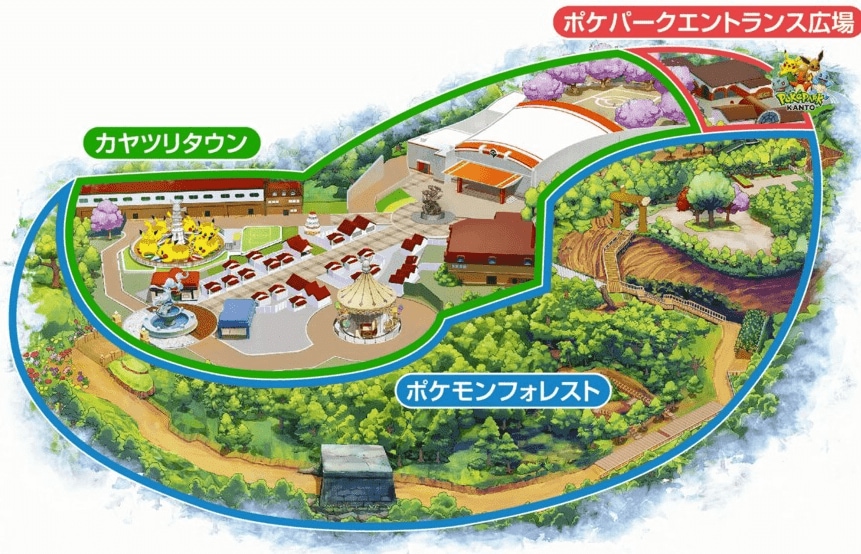 エリアは、起伏に富んだ地形を活かした森のエリアである「ポケモンフォレスト」と、グッズ購入やアトラクション、イベントなどが楽しめる「カヤツリタウン」に分かれています。