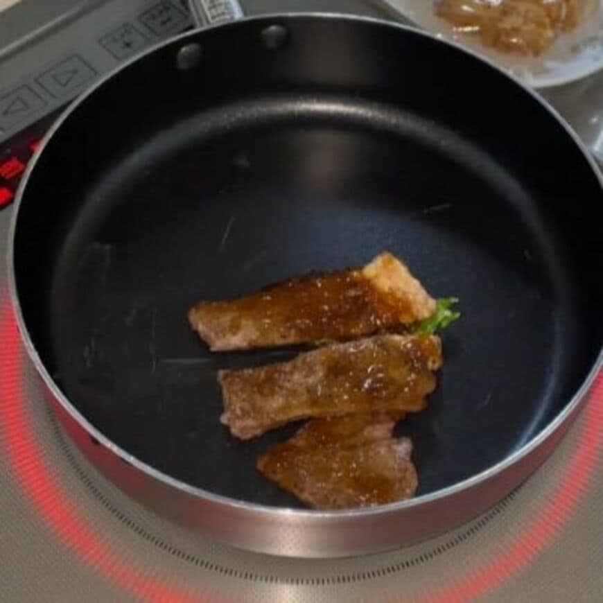 フライパンに調理済みのステーキを並べて温めます。