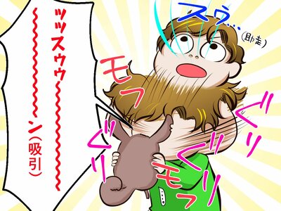なかでもたまらないのが、毛に顔をうずめてグリグリする「吸引」。今日も勢いよく大明神さんの毛皮に顔をうずめて吸引をはじめる祭さんですが…。