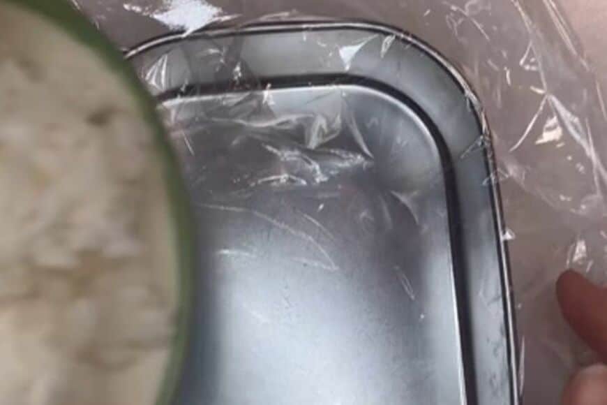 1. 【オムライス弁当】ラップを使って丁寧にオムライスの形を整えていきます