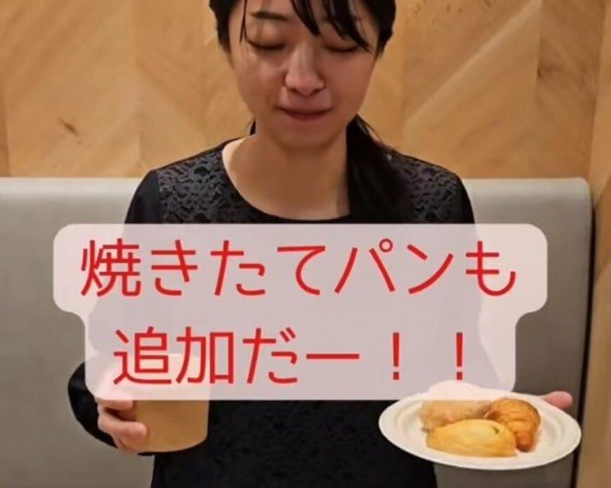 動画では、宿泊客の女性が「せっかくだしいっぱい食べるぞー!」と意気込む姿が。いろんなメニューを取って、おかわりもして、お腹いっぱいになりながらも「いいや!まだいける!」と焼きたてパンを追加。