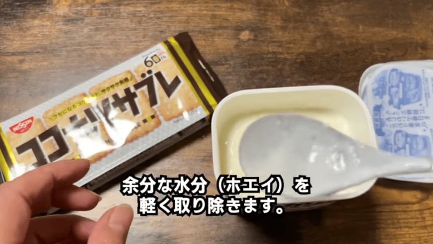 手に入れた材料でさっそく調理を開始!まずはヨーグルトをよくかきまぜ、余分な水分(ホエイ)を軽く取り除いていきます。
