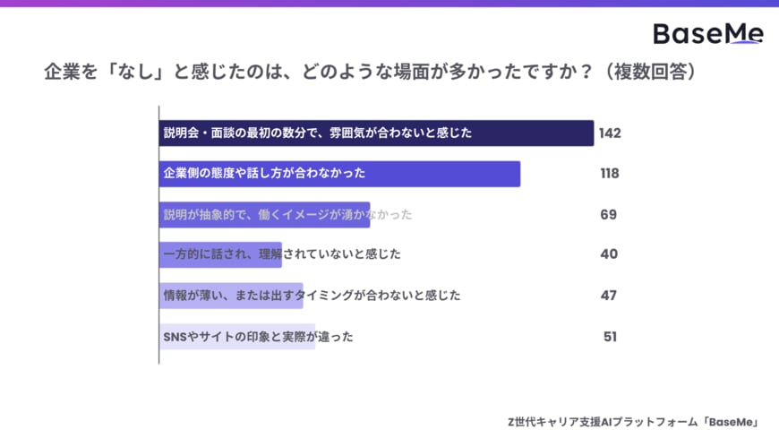 企業を「なし」だと感じてしまう場面として、最も多くの票を集めたのは「説明会・面談の最初の数分で、雰囲気が合わないと感じた」で142票に上りました。