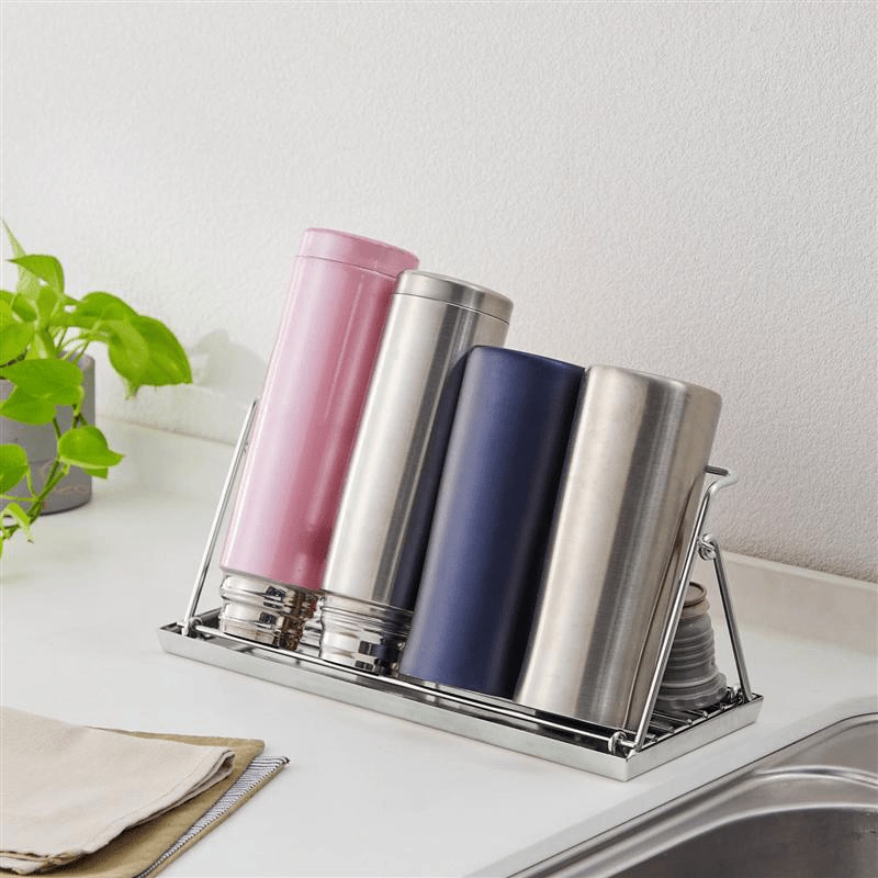 家族分の水筒やボトルは、洗ったあとに置き場所に困りやすく、倒れやすさや乾きにくさが気になることも。ベルメゾン「折りたたみ式ステンレス製ボトルスタンド」は約4本の水筒やマグボトルを立て掛けて干せるので、キッチンまわりをすっきり保ちやすくなります。