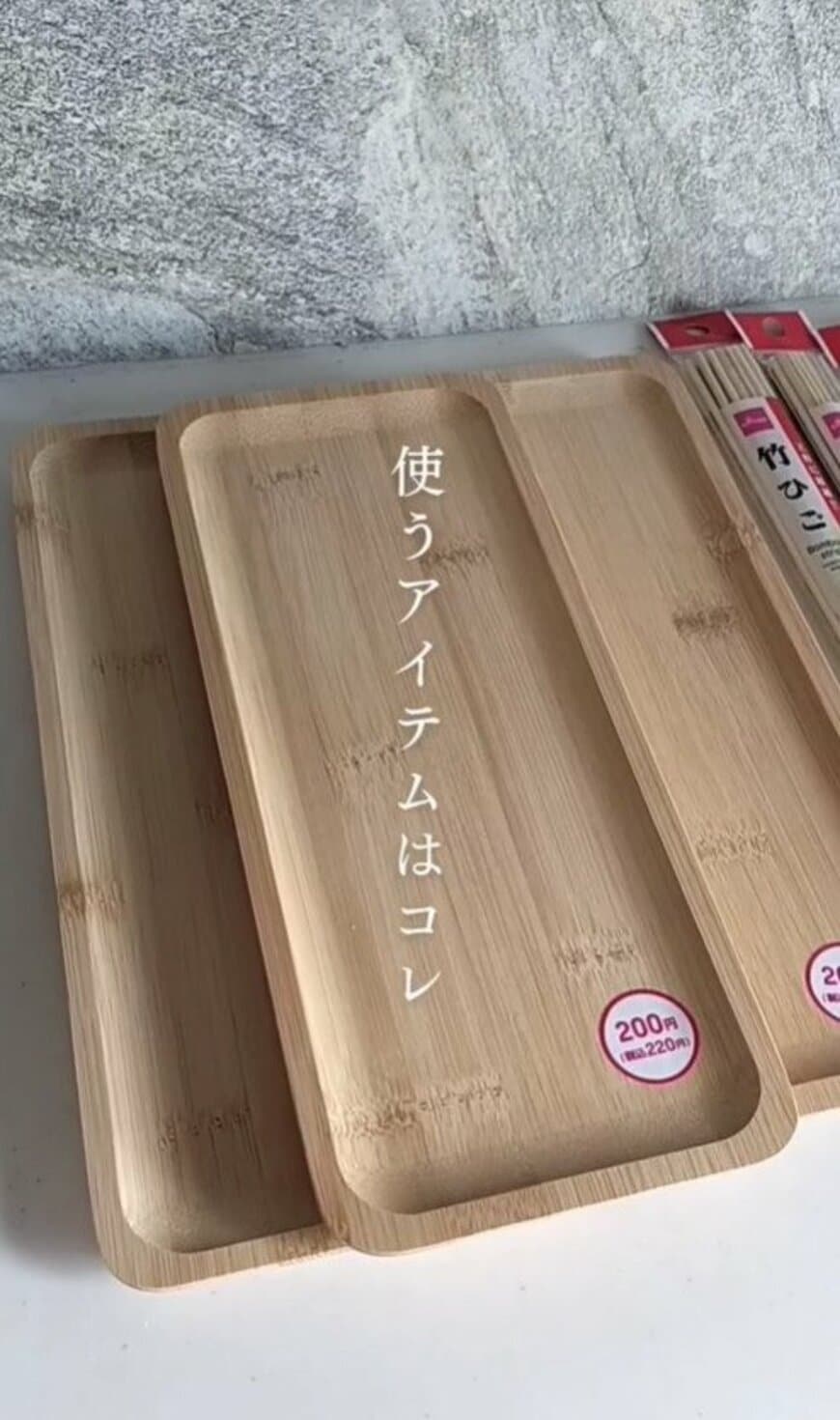 使う材料は、バンブートレー28cm×12cmを3枚、竹ひご36cmを3袋、バンブー蓋付きガラスキャニスターです。道具はグルーガンを使用します。