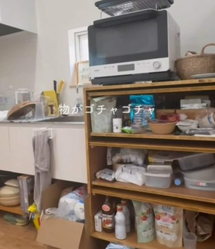 棚はごちゃごちゃしており、炊飯器も床に置かれています。