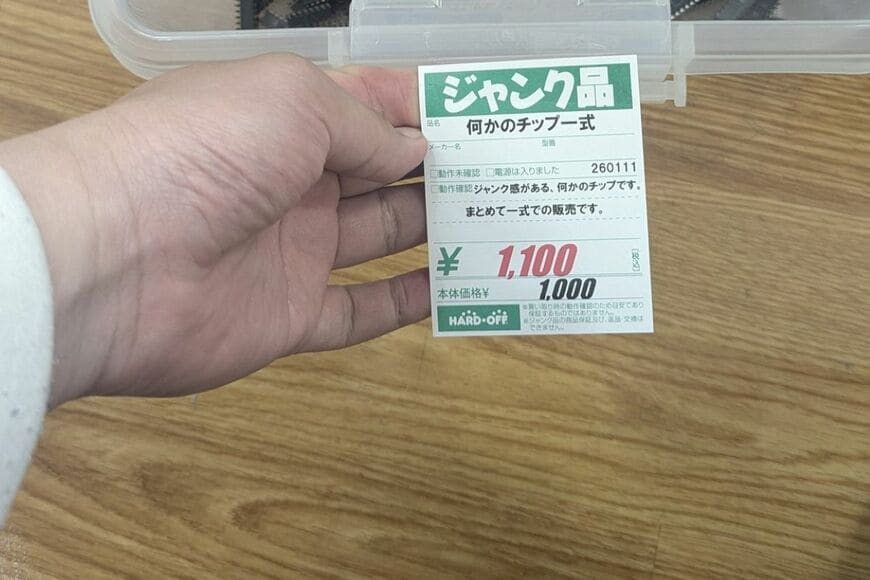 写っているのは、@karosoraさんがリサイクルショップで購入したジャンク品。「ヴィンテージのICチップ」がまとめて1100円で販売されていたようです。