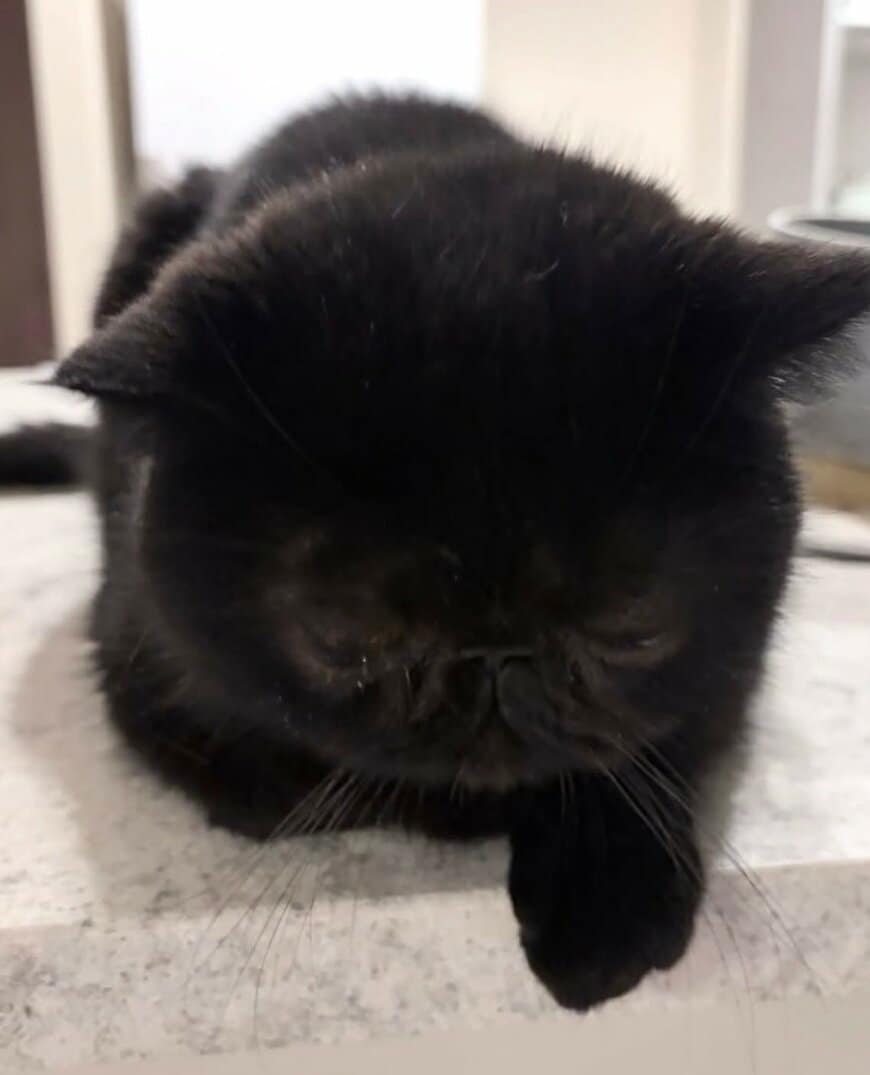 投稿に写っているのは、エキゾチックショートヘアのかげつちゃん。黒いふわふわな毛並みと丸いおめめがチャームポイントの女の子です。