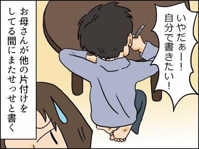 それを見たなおにゃむさんは「ここ名前を書く欄だから間違えてるよー。お母さんが修正液で消して書いてあげるから。」というと、「いやだぁ!自分で書きたい!」と、まっきー。