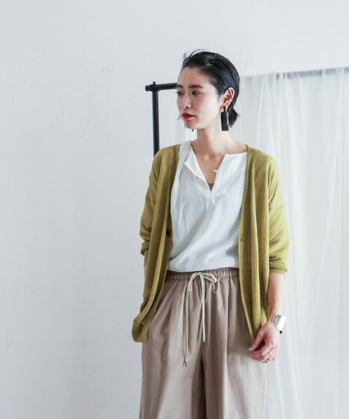 ドライタッチな素材感が特徴のリネンカーディガンは、夏場でもサラッと気持ち良く着られるアイテム。スラブヤーン特有の表情がコーディネートに程よくカジュアルさを演出してくれます。