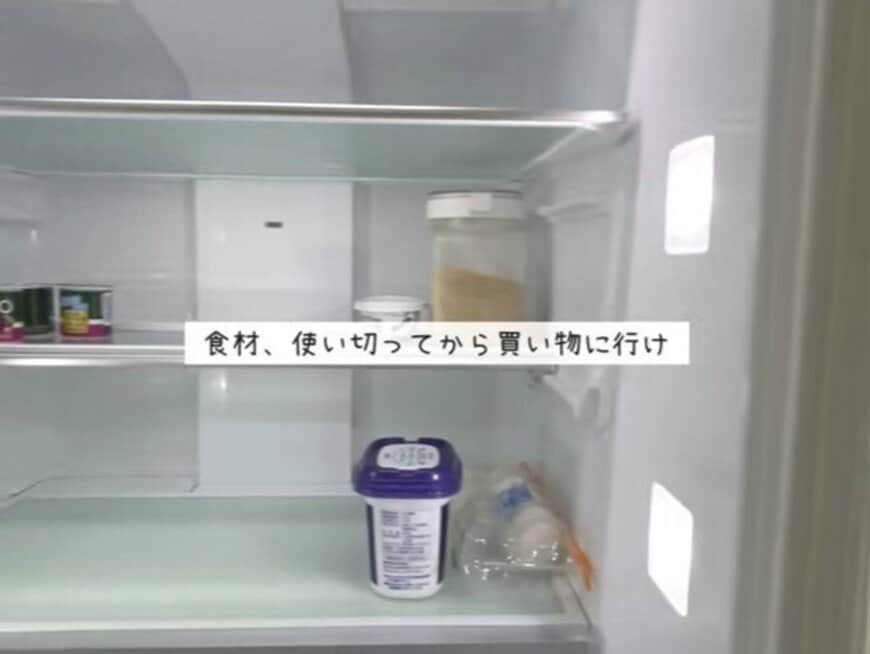 ミニマリストの@rei_minimalさんは、「食材、使い切ってから買い物に行け」と訴える通り、冷蔵庫の中は空っぽにしてから買い物に行くとのこと。