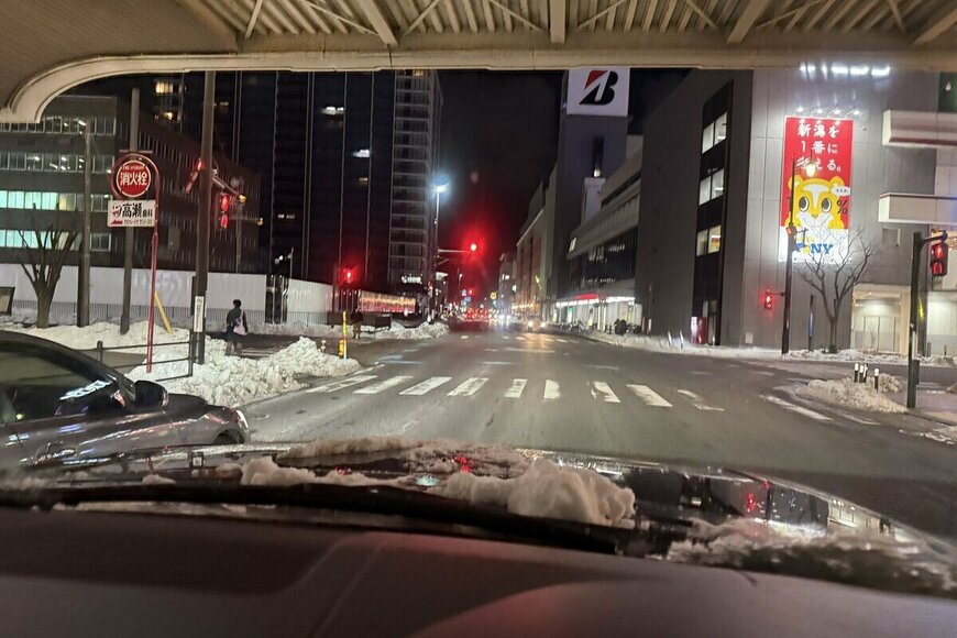 1枚目に写っているのは、新潟県の北東部にある「下越地方」。天気は晴れているようで、積雪は歩道側に少し見受けられますが、車道には雪が積もっていない状態です。