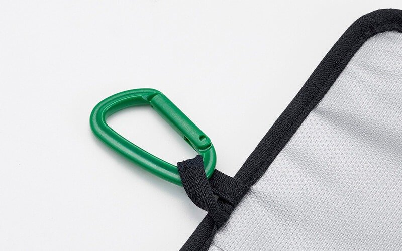 カラビナやストラップを通せるループもついています。カラビナをつけたら、リュックなどにポーチを吊り下げることもできて便利です。