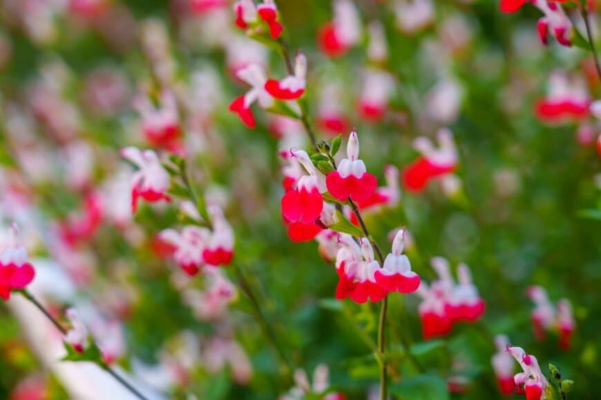 春の終わりから秋が深まる頃まで、フルーティーな香りを放つ小さな花を咲かせるチェリーセージ。赤、白、ピンクなどの花色があり、どこか野趣を感じさせる佇まいは、庭をおしゃれな雰囲気にしてくれます。
