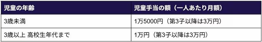 - 3歳以上高校生年代まで:月1万円(第3子以降は3万円)