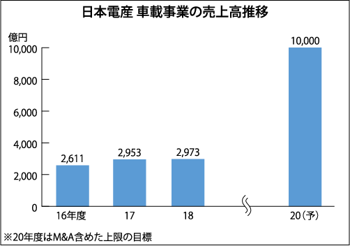 日本電産は1990年代半ばに車載事業に進出し、モーターをはじめとする様々な機構部品、デバイスを手がけている。従来の主力であったIT機器向け精密小型モーターの減速を受けて事業ポートフォリオ転換を打ち出し、13年度から重点事業の1つに車載を据えた。10年度に約700億円だった車載事業の売上高は、18年度には約3000億円に拡大した。