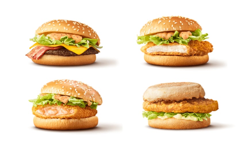 「ベーコンレタスバーガー」「チキンフィレオ」「えびフィレオ」「チキンマックマフィン」のソースを変更。さらにプレミアムローストコーヒーを改良、バリューセットのドリンクに+200円でフラッペとスムージーを選択できるようにしました。