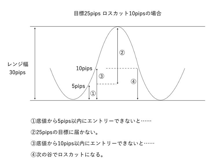 たとえば今、変動幅が上下30pipsのレンジで値が動いているとします。「10pipsでロスカット、目標25pips」のルールで利確するためには、底値から+5pips以内でロングエントリーするか、天井から-5pips以内でショート(売り)エントリーしなければなりません。これはなかなか厳しいです。