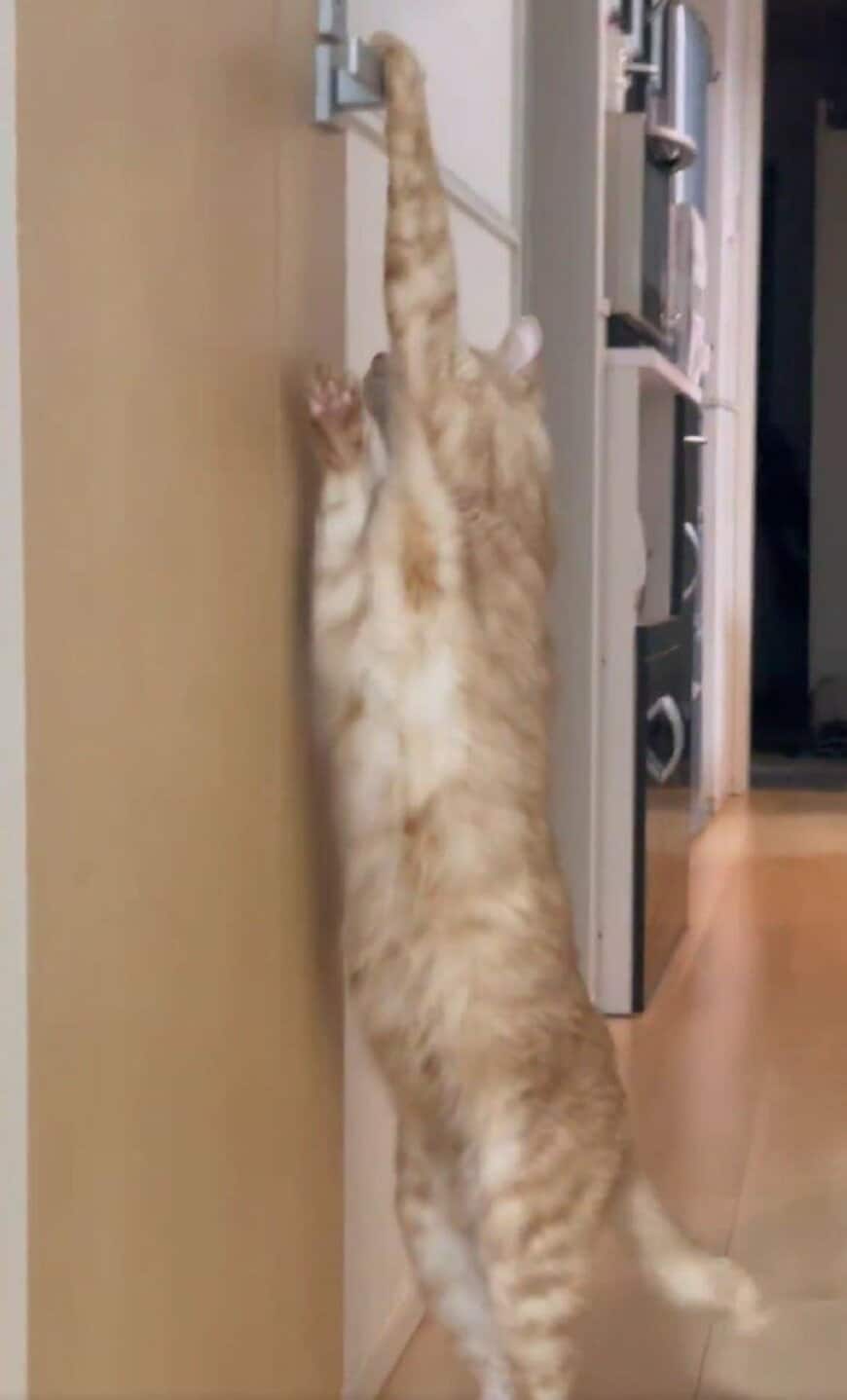 体をグッと伸ばして、ドアノブをお手々でいじっているようです。