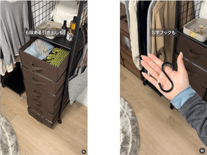 動画では、小物は引き出しの天面に置いたり、帽子はS字フックにかけたりしていて、あらゆるものをちょうどよく収まる様子が分かります。