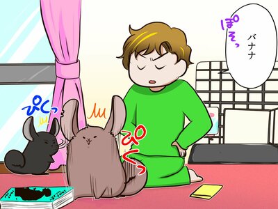 前回(第4話 リアルネズミ花火)、バナナで驚異的な表現力を見せたチンチラさんたちですが、実は、彼らはげっ歯類の中でも非常に知能が高いとされる動物。トレーニング次第では芸を覚えてしまう子もいるほどなのです。大明神さんと小明神さんも、芸はしませんが飼い主の顔はもちろん、簡単な言葉なら理解できている様子。