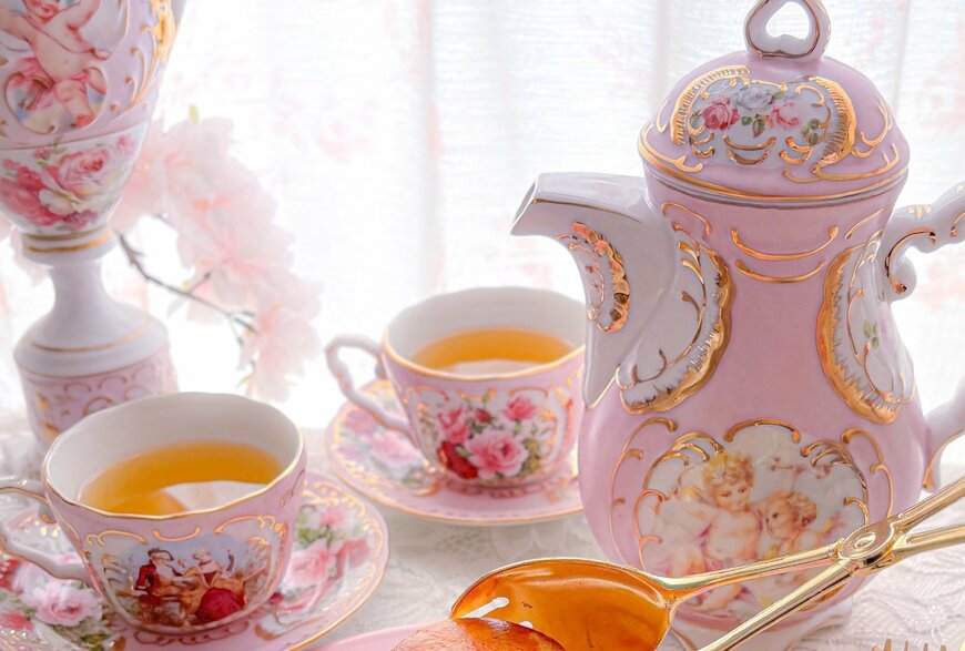そこに写っていたのは、上品なピンクを基調とした華やかなティーセットでした。まるで本当にマリー・アントワネットが使用しているかのような雰囲気を醸し出していますね。
