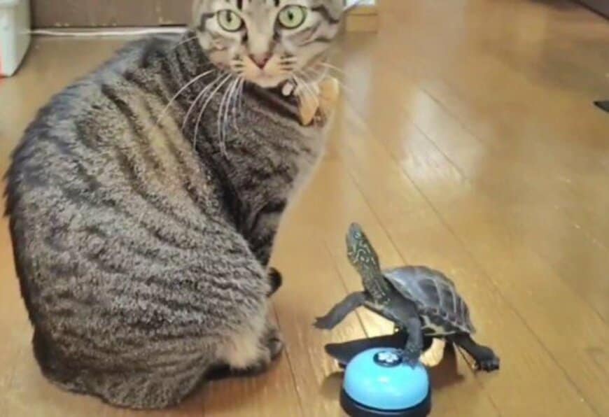 1. 懸命に猫を見つめる亀