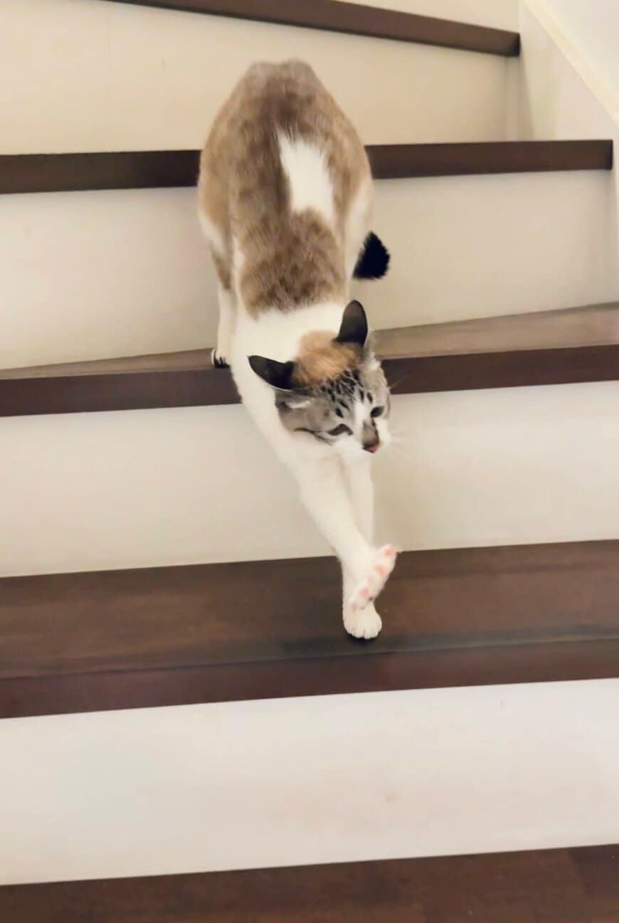 階段を降りてきたミントちゃんは、なんだか悲し気な面持ちです!「捨てないで~」と言いたげな姿に、思わず心をくすぐられてしまいますね……!