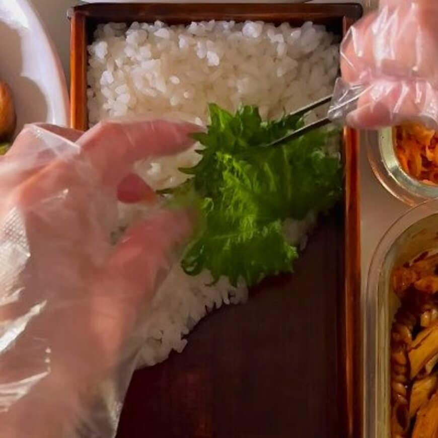 さっそくお茶碗に入れたご飯をお弁当箱に詰めていきます。お茶碗にご飯を用意しておくと、分量が分かりやすそうですね。