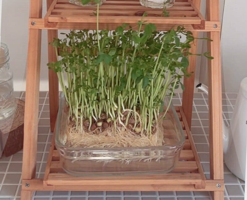 豆苗生産の国内大手・村上農園の検証でも、上側の脇芽を残して切ったほうが生育が早く、脇芽を残さず切った場合より2日早く収穫できたとしています。